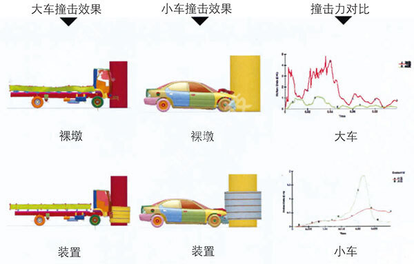 由撞擊效果對比可見,增設防車撞設施后,能夠有效地降低車輛撞擊力60%以上,延長撞擊時間,減少車輛破損,從而達到保護人員、橋墩和車輛的目的。