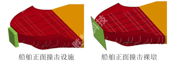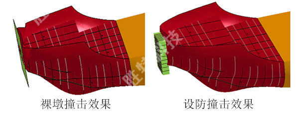 設(shè)防撞擊效果如下圖所示,防撞設(shè)施發(fā)生部分變形,替船舶分擔(dān)了動能的耗散。