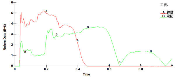 曲線A為未設(shè)置橋梁防撞設(shè)施的橋墩所受的船舶撞擊力,曲線B為設(shè)置了橋梁防撞設(shè)施后橋墩所受的撞擊力。從圖中曲線趨勢可以看出,設(shè)置防撞設(shè)施后,能夠明顯降低船舶撞擊力,延長撞擊時間,達(dá)到保護(hù)橋墩的目的。
